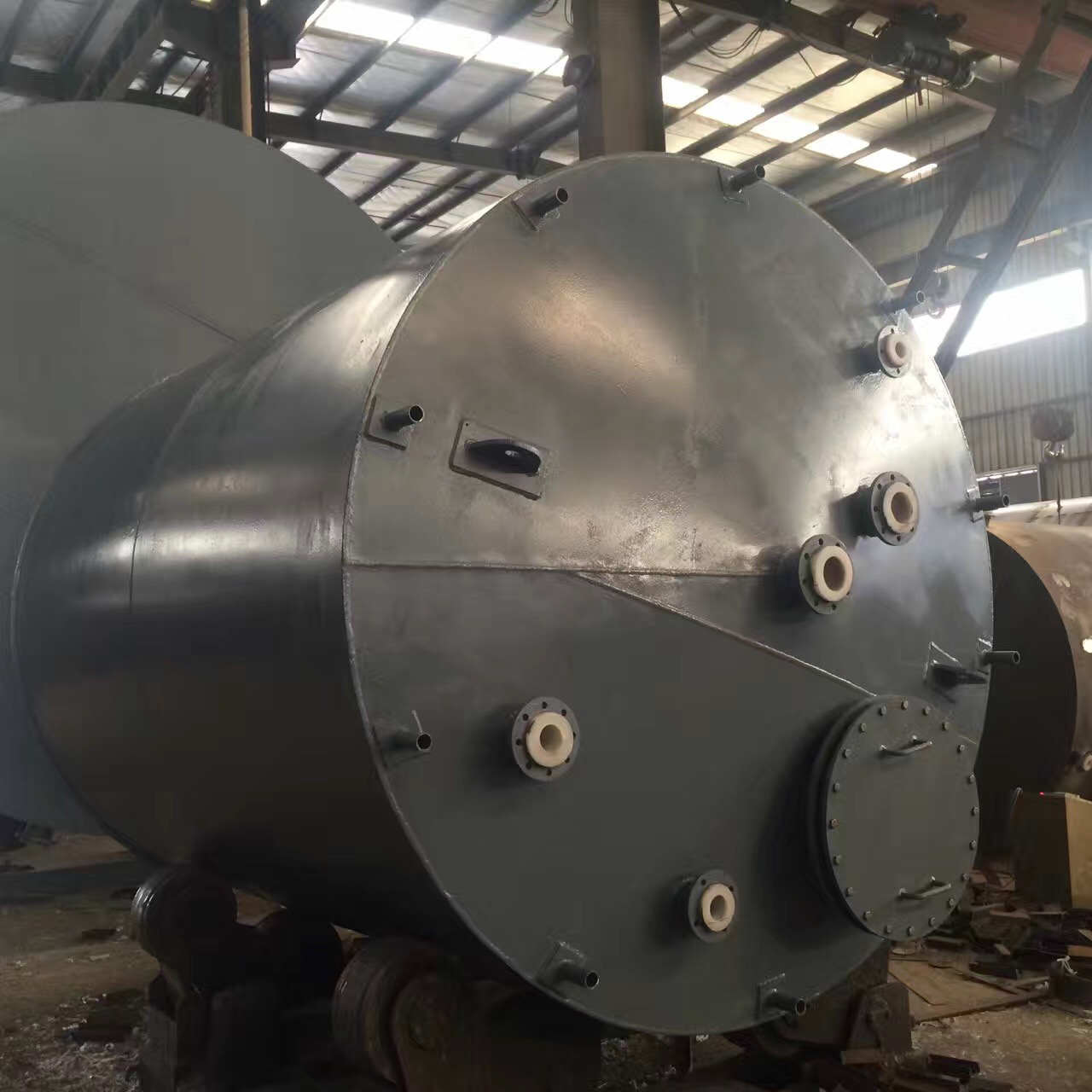 二. 鋼襯塑料(聚乙烯)貯運容器、反應設備系列:鋼襯塑(龜甲襯里————鋼、網、塑三合一)是鋼塑復合系列產品的精華。它是將鋼網(龜甲)焊接于鋼體表面,以聚乙為原料,采用旋塑工藝(滾塑技術)一次整體成型于鋼體表面,由于鋼網(龜甲)與聚乙烯為一體且鋼網焊于鋼體表面,使聚乙烯難以脫離鋼體表面。因而是一種極為優異的耐腐蝕產品。產品內襯面平整、光滑、堅固,與傳統的鋼襯塑料板儲槽、鋼襯玻璃鋼貯槽相比,具有更良好的耐腐蝕、不滲漏、不剝離、耐磨損、壽命長等優點,是裝運腐蝕液體的理想儲運容器,可應用于100℃以下的汽車運輸槽罐、低壓罐、真空罐、反應釜、交換柱、酸洗槽、電鍍槽等。